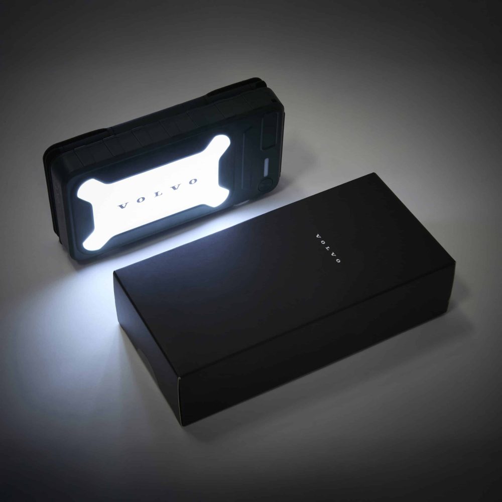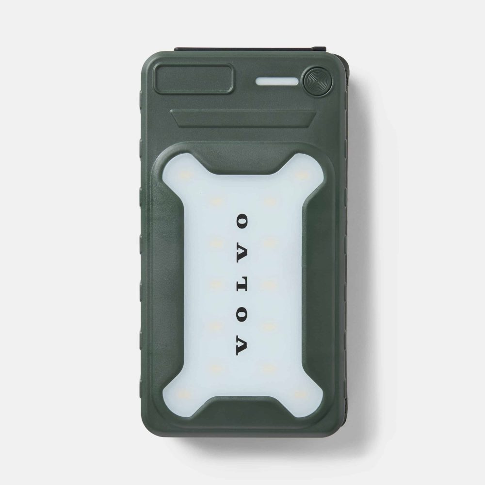 Se lataa laitteesi nopeasti sekä USB-C- että USB-A-liitäntöjen kautta ja sisältää sisäänrakennetun LED-valon, joka opastaa sinua pimeän tultua. Kestävä, helposti pakattava ja pitkäikäinen, lujatekoinen vihreä kotelo on merkitty Volvon tekstilogolla, joka on selkeä viittaus luotettavaan muotoiluun ja toimivuuteen.