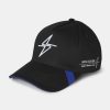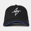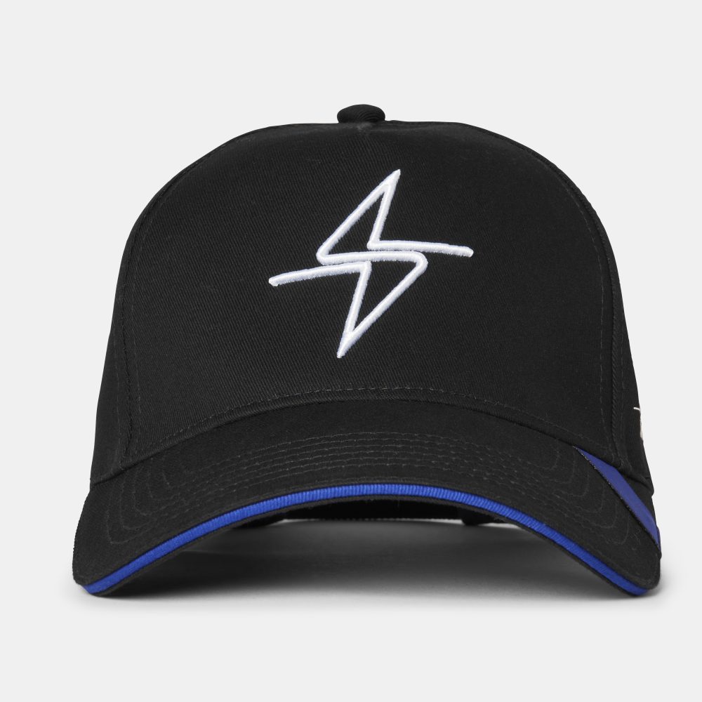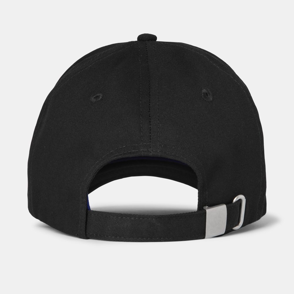 Musta lippis GOTS-sertifioitua luomupuuvillaa, jossa edessä kirjailu E-tech-grafiikka ja tekstiprintti "100% ELECTRIC RENAULT TRUCKS E-TECH" vasemmalla puolella. Lippiksellä sininen putkisto ja kokoa säätävä metallisolki takana.