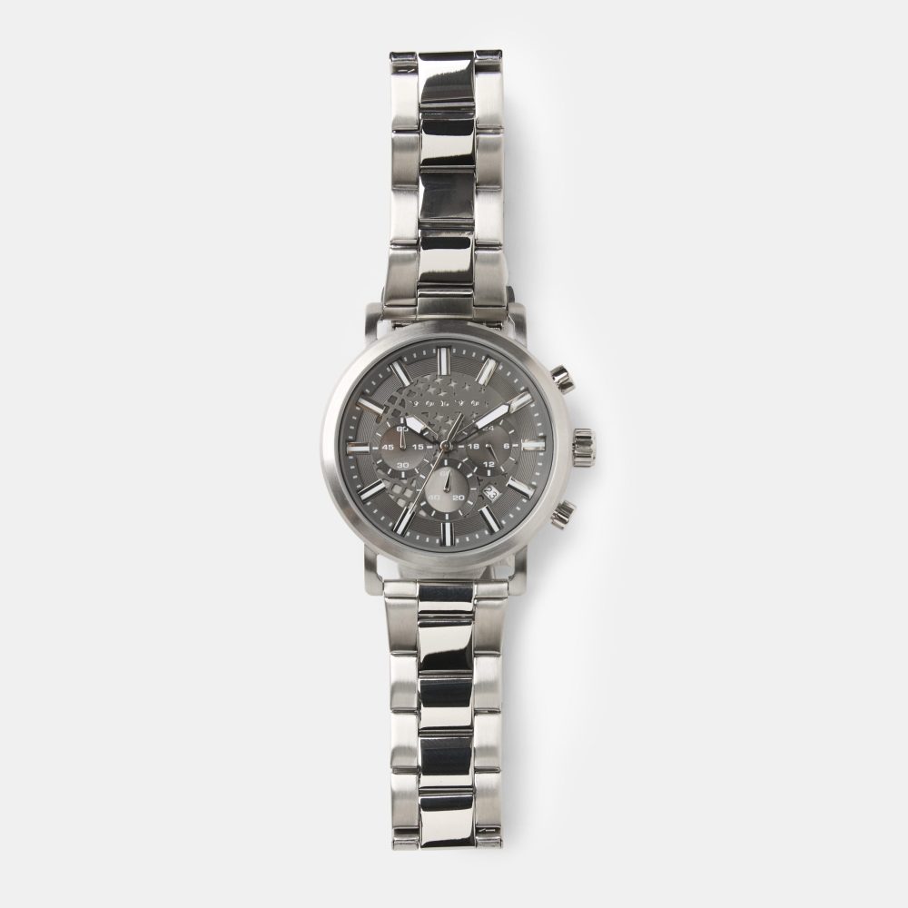Näyttävä kronografi ruostumattomasta teräksestä valmistetulla kuorella ja rannekkeella, joka on suunniteltu sekä tyyliä että kestävyyttä ajatellen. Monikerroksisessa harmaassa kellotaulussa on kolme aputaulua, päivämääränäyttö ja näyttävät tuntimerkit, jotka antavat kellolle modernin ja teknisen ilmeen.