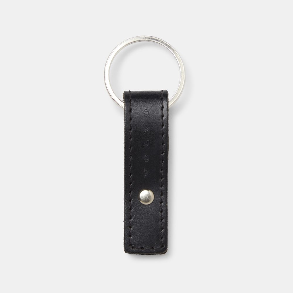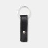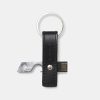 Musta nahkainen avaimenperä taitettavalla 32 GB muistitikulla. Metallirengas avainten kiinnitykseen ja Volvo-logo kohokuvioitu edessä.
